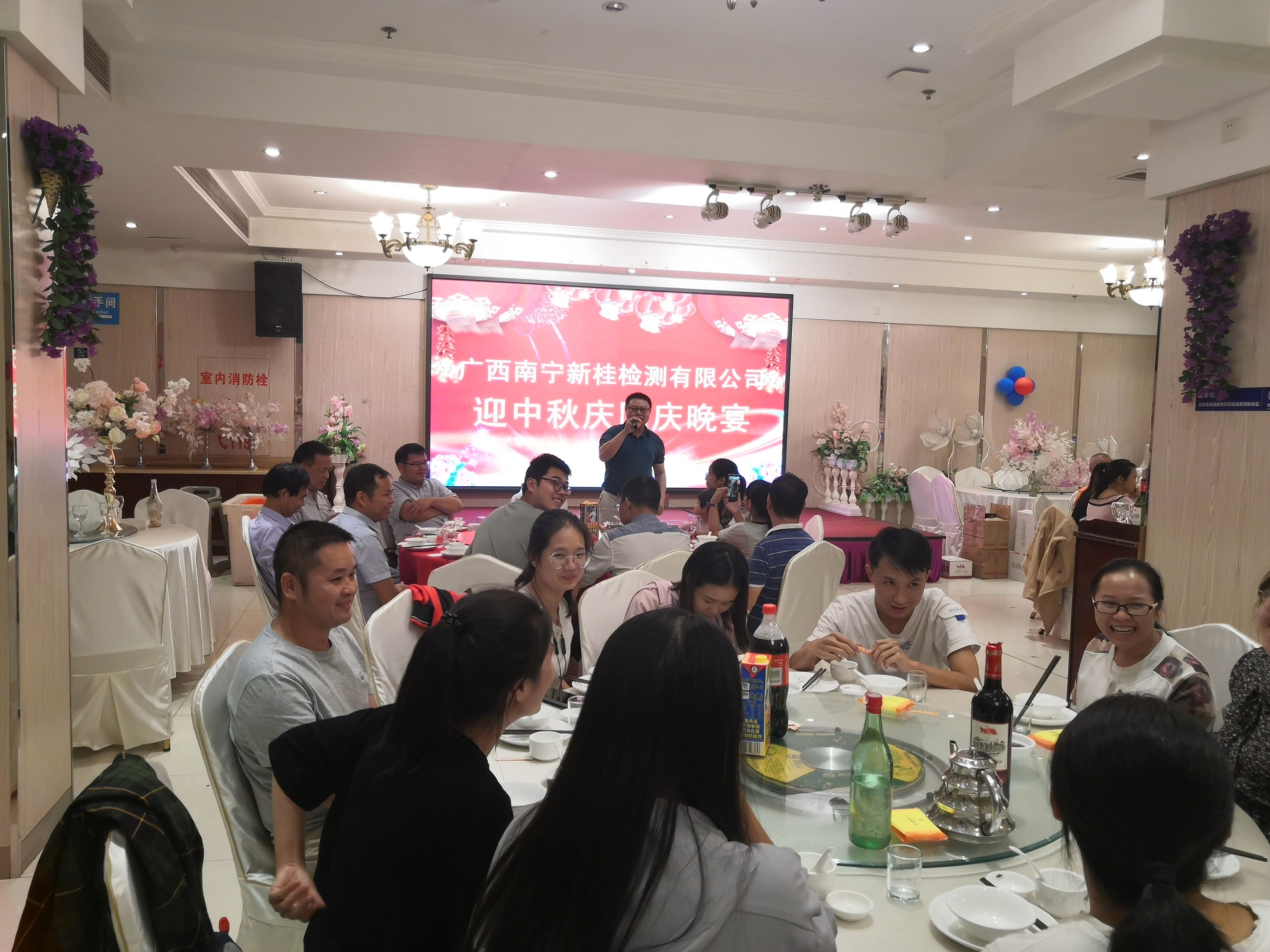 2020年不凡之年,新冠病毒使我国受到重创,也使世界带来灾难。全国开展了空前绝后的抗疫行动,众志成城,阻击了疫情肆虐。新桂公司上下同舟共济,共克时艰,保经营、稳人心、谋发展取得了来之不易的成绩。在中秋国庆双节来临之际,为答谢全体员工的辛勤工作,公司开展丰富的节日活动,举办迎中秋庆国庆晚宴、发慰问金、中秋月饼等。9月28日在南宁肥仔星光店举行了迎中秋庆国庆晚宴,公司总经理甘惠云给全体员工送上节日问候和美好祝愿。